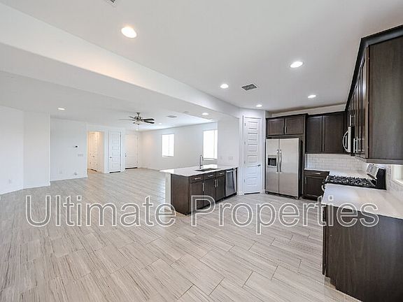 4 bedroom + 2 bathroom home in Surprise. Open floor plan. Kitchen features granite counter tops, stainless-steel appliances, range/oven, built-in microwave, dishwasher and refrigerator. Master suite features dual sinks, stand up tiled shower and walk in closet. Backyard features covered patio and artificial turf. Easy to maintain landscaping! Located near Loop 303 for quick freeway access! Community amenities include parks, green belts, basketball