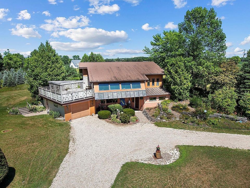...A COUNTRY PARADISE w/woods & more! North of Mishicot on 2.9 acres you will find uniquely style & built hm for the energy conscious owner! Custom built, one-owner, you will be in awe of how well built this is. 24' solar panels, VERY LOW COST to heat, air to air exchanger, central vac, galvanized metal shingle styled roof & much more. 1.5 car att, lg family room w/wet bar, 1st-floor ldy, 1st-floor full bath, storage, open & curved staircase to upper living area PLUS a 2-story great room. Not a cookie-cutter plan. Upper level has primary bedroom suite w/dual access, 2nd bedroom, kitchen (with pantry), dining & sunrm w/access to roof top patio. 5000SF (per seller) outbuilding space + other storage & workshop. Many updates! Take a look TODAY!!! AGENTS: STATUS=OFFER W/BUMP