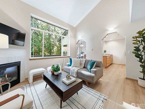 Experience elegant living in this beautifully updated 3 bedroom, 2 bath townhome-style condo, thoughtfully designed for comfort & style. A main-floor bedroom adds convenience, while soaring vaulted ceilings & a cozy gas fireplace create a warm, inviting atmosphere. Freshly painted with new flooring throughout & new appliances, the home is truly move-in ready. The dining area opens to a private deck overlooking a tranquil, tree-lined setting. Exceptional extras include a private garage (oversized), bonus carport & an expansive 11’3"x 10'11" storage rm—perfect for a wine cellar, workshop, or hobby space. Ideally located w/easy access to I-5, I-405, transit, shopping & the upcoming light rail. NO RENTAL CAP-an incredible lifestyle & investment