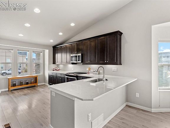 Welcome home to this beautifully maintained 4 bedroom, 3 bathroom home built in 2019. This home shows pride of ownership and a long list of upgraded features including LVP flooring, gas stove, oversized garage and covered patios. Not only does this floor plan have main level living, it also has a secondary bedroom and full bathroom on the main level! The basement has a massive living space, wet bar, ample storage, a full bathroom and two additional bedrooms. The generously sized corner lot is professionally landscaped and fenced on one side. If you’re looking for a practically new home in a growing area near shopping, conveniences and I-25, you’ve found it! Schedule your showing today.