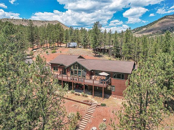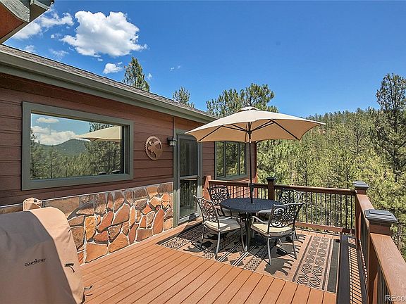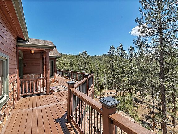 Welcome home to perfection, as this looks and feels like a brand-new home. Total of 6.18 acres of woodland privacy with the purchase of the adjoining 4.16 acre lot for $135k (with 2 homesites!). The home’s newer composite deck offers unobstructed views of the Pine Valley Ranch Park & The Pike National Forest. Upon entering the foyer, an airy great room with lots of natural light gracefully flows into an all-remodeled kitchen. The kitchen boasts custom stonework, granite counters, ash cabinetry, copper farmhouse sink and flue, walk-in pantry, and gas range. On the same main level, the over-sized primary suite could also easily accommodate a sitting area or workout space and opens onto the deck. The en-suite remodeled bath features a granite dual vanity, separate walk-in shower, jetted tub, and an enormous walk-in closet. A powder room, laundry room, and garage entry make this home truly main level living. The lower level offers another gas fireplace and a full kitchen! Three oversized bedrooms and 2 baths allow for everyone in an extended family to spread out. There is a walk-out to a covered sitting area perfect for snowy days. Outdoor enthusiasts are walking distance to Pine Valley Ranch Park, and from there, you can easily hike or mountain bike into the National Forest. World class fly fishing is located within 15 minutes and the wildlife viewing never disappoints. This home offers a brand new roof, new central air conditioning, a paved driveway, and new exterior paint. 10-15 minutes to schools and shopping.