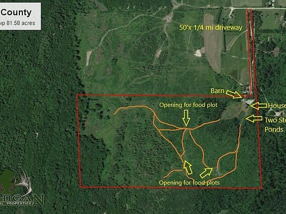 Here is your opportunity to own a turn key 2300 sq ft hunting lodge that sits remotely on just over 80 acres!! This Alpena County property is loaded with deer and turkeys. The 4 bedroom 2 bath features hardwood floors, knotty pine interior, ceramic baths and a 16' bar with kegerator. There is a smaller deck and balcony out the front and large covered ones out the back that view the two stocked ponds. Home comes equip with remote start diesel back up generator. There are a couple sheds and a newer 24'x36' barn with 11' sidewall and 3 10'x10' overhead doors. There is brand new in the box solar system that was going to be used to power the barn that goes with it. The property has a good trail system with many openings that will make excellent food plot locations.