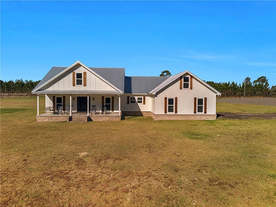 Welcome to your dream farmhouse! This beautifully designed home sits on 5 serene acres, offering the perfect blend of country charm and modern convenience. Located just over the Brantley County line, you’ll enjoy the benefits of a Waycross address with a peaceful rural setting. From the moment you arrive, you'll be captivated by the inviting front porch—with a cozy swing—overlooking a spacious front yard. Step inside to find a warm and welcoming layout, starting with a formal dining room (or home office) off the foyer. The generously sized family room is perfect for entertaining and flows seamlessly into the chef’s kitchen, featuring an oversized island, gas range, custom cabinetry, and plenty of storage. There’s even a charming breakfast nook for casual meals. The primary suite is a true retreat, designed for relaxation with a spa-like bathroom that boasts a freestanding soaking tub, oversized shower, dual vanities with a stylish shiplap accent, and two walk-in closets. The main level also features a convenient laundry room and a powder room. This thoughtful split floor plan places the secondary bedrooms on the opposite side of the home, ensuring privacy for everyone. The bedrooms are spacious and share a well-appointed hall bath (full bath). Upstairs, a versatile bonus space awaits—perfect for a playroom, office, home gym, or even an extra bedroom. Step outside and fall in love with the outdoor space! A covered back porch overlooks the private backyard, creating the perfect setting for relaxing, hosting gatherings, or simply enjoying the peaceful surroundings. The seller is willing to leave the land essentials including the lawn mower, utility trailer, and the side-by-side ranger making this a turn-key property. With so much to offer, the possibilities are endless in this beautiful farmhouse retreat! Don't miss your chance to make it yours!