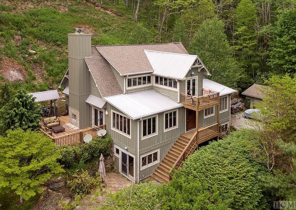 Imagine watching from the deck as the sky turns from purple to blue as the stars fade and the sun rises over the mountain, hearing only the songs of birds and frogs, and the stream as it meanders to the pond below. This three-bed, three-bath, exquisitely appointed mountain home sits on over 12 scenic, private acres in the close-knit Big Ridge community, just 10 minutes from Lake Glenville and 20 minutes from downtown Cashiers. The open floor plan with a dining area and a great room features 20-foot ceilings, a wood-burning fireplace with gas starter, and a stone and wormy chestnut fireplace. The kitchen offers an expansive island, Thermador gas range, custom cabinetry, and a large pantry. Ten-foot ceilings, custom lighting fixtures, and gorgeous wide-plank oak wood flooring fill the main level, which features two large bedrooms, both with en suite baths. Tall banks of windows let in natural light, begging to be thrown open to the sights and sounds of nature and the cool mountain air. A cardroom just off the foyer is perfect for entertaining! The spacious upstairs master suite with an adjacent loft overlooking the great room has a coffee bar with a mini-fridgeand a walk-in closet and is ready to accommodate a gas fireplace! The sunroom/office extends toward the private front deck with views of the pond, mountains, and southwest skies. The master bath has a clawfoot soaking tub and shower. Just off the great room through French doors, step out onto an expansive deck with an outdoor, wood-burning fireplace with a gas starter. The covered cooking station is outfitted with a gas line for grilling. Walk-out basement w/ lots of windows, two sliding doors, and separate exterior entry opens to a rock patio. Stone-walled wine room w/ custom-shelving, billiards/game room, full bath, and gallery space which could easily accommodate additional sleeping quarters. Separate garage w/ workshop area.