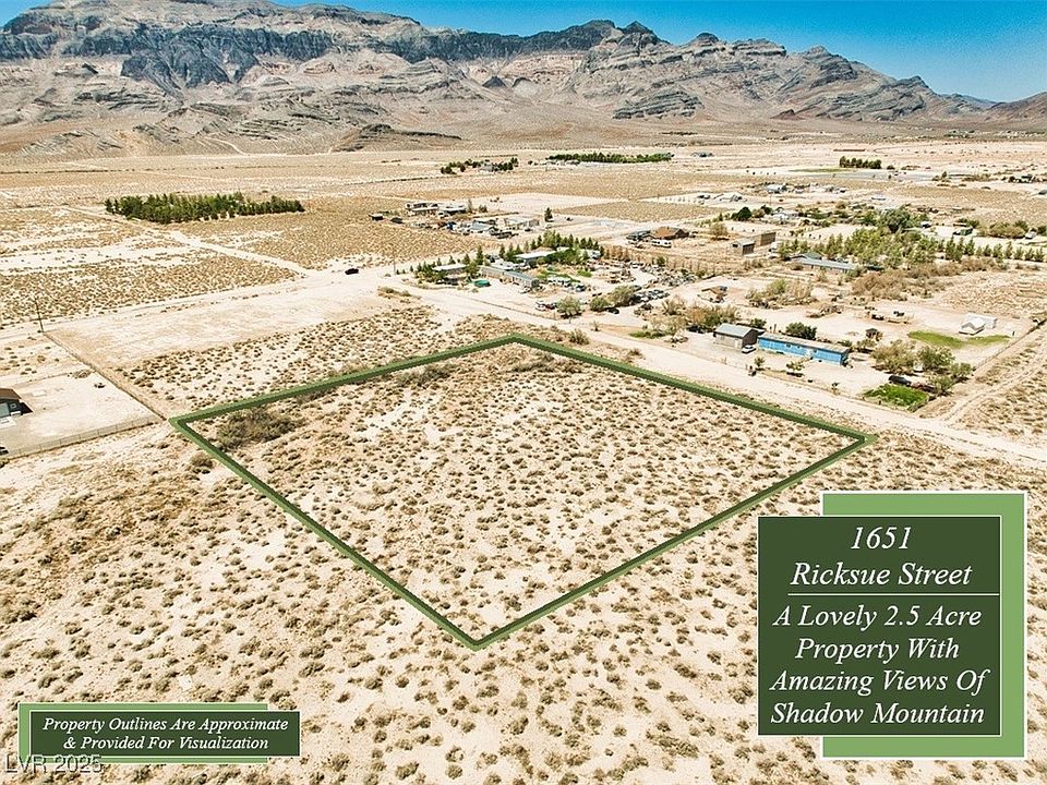 1651 Ricksue St. Offers Amazing Mountain Views & Over 100,000 Sq. Feet For Your Pahrump Plans~~~This Wonderful 2.5 Acre Parcel Is Located In Northern Pahrump & Less Than 15 Minutes To The Center Of Town~~~Nicely Situated In An Area With Larger Sized Parcels & Wide Open Spaces With Splendid Views Of Shadow Mountain~~~It Is Zoned For Private Well & Septic &, As With Most Pahrump Acreage, Water Rights Are Required To Drill A Well~~~Power Is Available Approximately 350 Feet Away~~~Ask About Lenders That Are Now Offering Land Loans With 20% Down & Monthly Payments~~~If One Acre Is Not Enough For Your Pahrump Dreams, Then 1651 Ricksue St. Is The One For You~~~Don't Wait For Prices To Keep Going Up & Lock In Your Piece Of Pahrump Today!