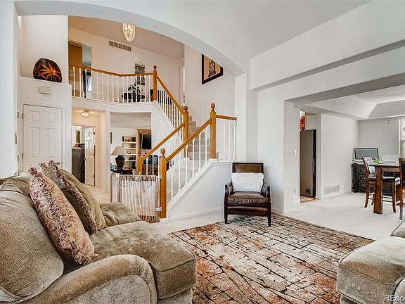This beautiful well maintained home in Aurora Highlands is a great find! This inviting home offers 4 beds / 4 baths and over 2800 sq ft. Enter into the front living area with high ceilings and a ton of light and opening up to a lovely open staircase and formal dining room. The dining area is large and directly off the open kitchen which has beautiful white cabinets with nickel pulls, hardwood floors, island and an eat in area perfect for breakfasts or informal family dinners. The kitchen opens to the family room with a brick fireplace, built-ins, carpet, ceiling fan, a half bath and a ton of light from the many windows. Upstairs you will find 4 bedrooms including the master with vaulted ceilings, plenty of space with an en-suite bathroom, 3 additional bedrooms and another full bath. Enter into the basement with a large great room perfect for additional living, game room, entertaining, fitness room, etc. There is also an additional full bathroom! Outside enjoy your private yard with a covered patio perfect for enjoying the beautiful Colorado days. Trampoline is included! This house is the perfect family home in a great neighborhood. Light, bright and a ton of space! Don't miss out.