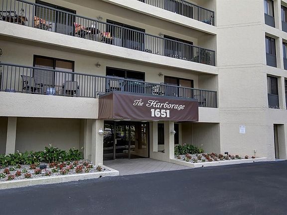 JUST REDUCED!!!Surprisingly direct Gulf, pool and yacht basin views from this elevated 1st floor condo within the newly updated Harborage 1 complex on South Sand Key beach. Enjoy a true split plan with all exposures to the West and balcony access from every room. Neutral appointments throughout provide an opportunity for an immediate purchase and move-in. Skim coated ceilings, an open kitchen, newer stainless steel appliances are just a few of the upgrades of this value conscious condo. The Harborage enjoys covered parking, ample guest parking, a heated pool and access to boat slips, either as a rental or purchase assignment.