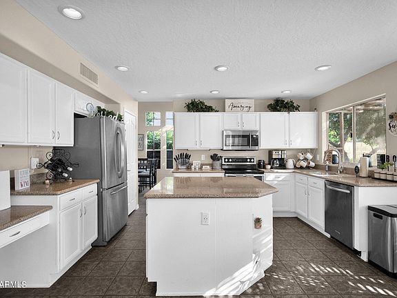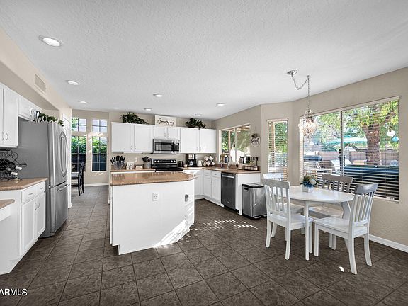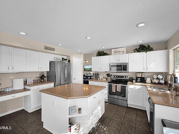 The spacious eat-in kitchen features white cabinets, stainless steel appliances with granite countertops and island, and a large pantry.