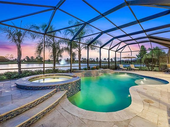 Conveniently located close to the gated entry and across from The Lodge in Country Club East. Elegant style and breathtaking lake views are what you'll find at this Palmavera floor plan home by Neal Signature Homes in Country Club East. This maintenance-free residence boasts 2,933 square feet with three bedrooms, two and one-half baths, a den, and a private pool and spa. With a spacious floor plan, expansive covered lanai, chef's kitchen, and also an outdoor kitchen, entertaining is easy and fun. The indoor kitchen has gas appliances, a wine cooler, solid wood cabinets, large island, and stone backsplash. The outdoor kitchen has a Lynx grill, sink with disposal, designer hood and granite counters. Sliders from great room to lanai pocket and unite indoor and outdoor space beautifully. Pool and spa with the backdrop of the lake and fountain allow stunning views and unforgettable sunsets. Master retreat offers dual closets, dual vanities and a luxurious walk-in shower. Home has almost every upgrade imaginable including custom built-ins, Bose surround sound, glass tiles, wainscoting, crown molding, impact windows and doors, ceiling details, designer lighting, professionally designed drapes and shutters, pool auto-refill. Home shows like a model, even the laundry room is spectacular. Residents of Country Club East enjoy The Retreat Aquatic Center. Lakewood Ranch is the best-selling multi-generational community in the USA. Located close to world-class dining, shopping, beaches, and A+ schools. All furnishings have been removed from the home since photos were taken.