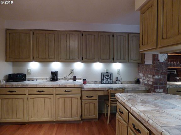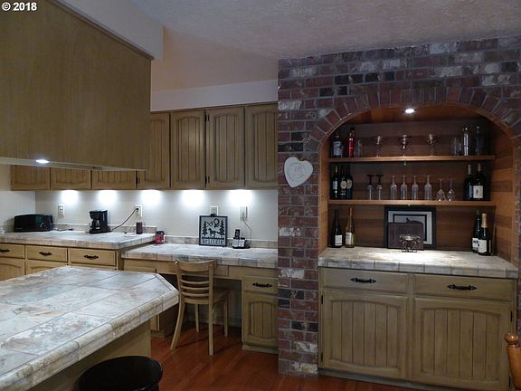 Nicely remodeled inside w/lg rooms through out, remodeled kitchen w/lg eating bar, desk, wood floors, tile counter tops open to living room w/vaulted ceiling brick fireplace and wood floors, dining room w/slider to patio, lg master suite w/walk in closet, full bath, slider to patio, utility room w/lots of storage, sink, garage was converted to family room, easy to convert back to garage, 20x15 work shop, garden shed.