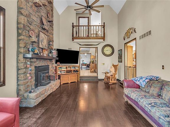 DON'T MISS OUT on a chance to own this expansive 50+ acre retreat, featuring a spacious family home, huge barn w/ horse stalls & a large workshop area. The main house is filled w/ natural light, due to an abundance of windows & an open, airy design. Step into the 2-story entryway w/ an impressive staircase leading to an open-concept living area. The massive family room boasts soaring ceilings & a floor-to-ceiling stone fireplace w/ a wood-burning stove.