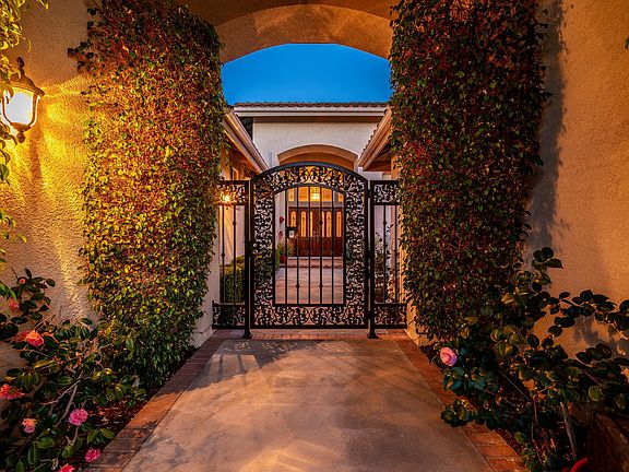 Rare Offering. Timeless elegance abounds in this exquisite single story Rosewood Estates home. Prepare to be dazzled, from the moment you enter through the iron gate into a private courtyard. Step into the formal living room with soaring 15 FT ceilings and windows galore, that bring the outside in. Perfect flexible floor plan of almost 3500 SF. Private master suite with on-suite, opens to spa. Music/exercise room. Separate wing has three more bedrooms Two share a Jack and Jill bathroom, and the third has it's own on-suite bath. There's an office/bonus room and a guest powder room. You will love the spectacular gourmet custom kitchen with Mahogany cabinets, granite counters, SS double oven,, six burner stove with griddle and pot filler; two dishwashers, warming oven, and a wine lover's fridge. Enormous island with seating. Walk-in pantry. Expansive kitchen windows with serene hillside views. Large family room features custom cabinets, flat screen TV. Outdoors, find a custom island/bar, built-in gas and charcoal BBQ's. Plenty of space for guests to gather in multiple seating areas. Enjoy the serene views and a bubbling spa. Avocado, apricot, lemon, lime, peach, plum, pear, and Cherry trees. Newer HVAC units/duct work. 3 car gar. Parks/tra