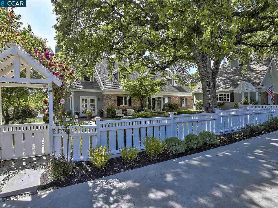 1652greenvalley.com - Charming Cape Cod, two-story home in heart of Danville on park-like, almost half-acre along private, secluded driveway. Built in 1945, updated to 3,219 sf, well appointed with hardwood floors, dual pane windows and French doors, crown molding, wainscot, plantation shutters, multiple build-ins, plush carpeting, three fireplaces. Four bedrooms, four bathrooms, including main level bedroom and nearby bathroom, formal office/5th bedroom behind glass French doors, updated kitchen with stainless appliances, farm sink, Quartz counters and breakfast bar, casual dining nook, family room, formal dining and living rooms. Front brick patio and gardens including pond and fountain under canopy of Heritage Oak. Rear veranda spans width of home overlooking sprawling lawn bordered by towering redwoods and gardens. Detached two-car garage, dual zoned HVAC, Less than half mile to top-rated K-12 SRVUSD schools and minutes from downtown Danville, Highway 680 access, Mt. Diablo State Park and walking trails
