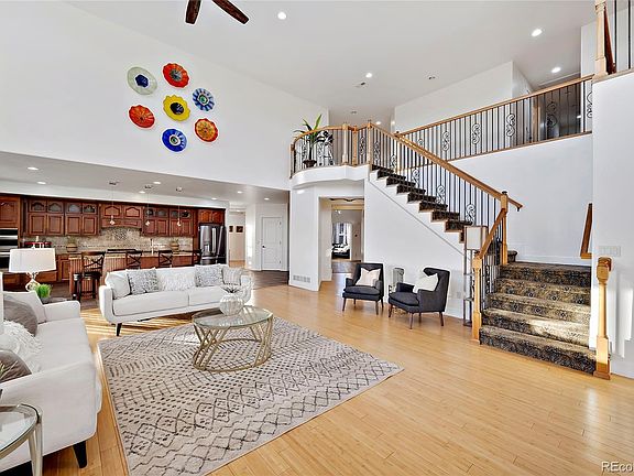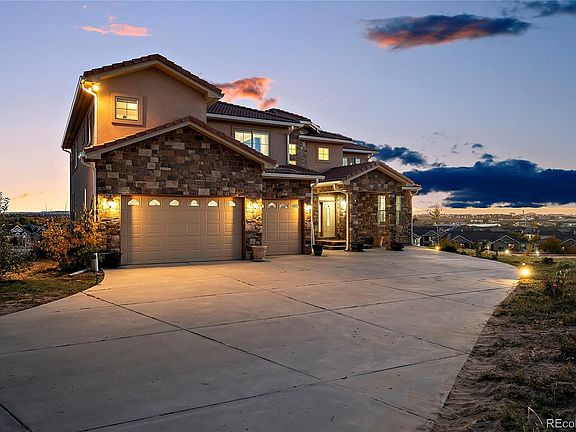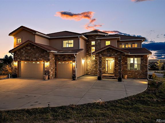 7,000+ sqft home with unobstructed mountain views in the highly sought after neighborhood of Foxfield. This lavish custom home has an inviting open floor plan including 5 bedrooms and 6 bathrooms! This expansive retreat covers 2 acres with views of open space and mountains. The impressive foyer is crowned with a custom chandelier where windows abound offering natural light. The impressive elegance of finishes and fixtures enhance the craftsmanship of this like new home. The airy floor plan flows along the hardwood clad flooring of the spacious main level opening up to the kitchen, living and dining areas. The cathedral ceiling in the living room is elevated by an impressive stone fireplace that towers over the bright expanse. A dream Kitchen with spectacular granite counters, high-end appliances, coffee bar, Island, breakfast nook, double-ovens will make entertaining a pleasure. Adjacent sliding doors open onto a Trex Deck patio with views for miles & plenty of seating for guests. A formal dining room topped with a gorgeous crystal chandelier and a second stone fireplace offer more room for gathering. The primary suite with yet another fireplace creates a cozy sanctuary complete with luxurious spa jet tub, rainfall shower, sitting area, & enormous walk-in closet. Windows facing the west give way to spectacular mountain views. This home also features a home office, extra loft space and an a nearly 2000 sq ft walk-out basement to the private fenced court yard. This space is already finished but could easily be converted to create your dream media room, gym or wine cellar. All washrooms feature crystal lighting, granite counters, and beautiful title/stone work. Riding mower and garage cabinets included. Close to Cherry Creek park, walking trails, shopping and fine dinning. Zoned for Horses/Income. Approved income/business property. Low utilities!