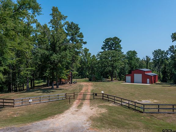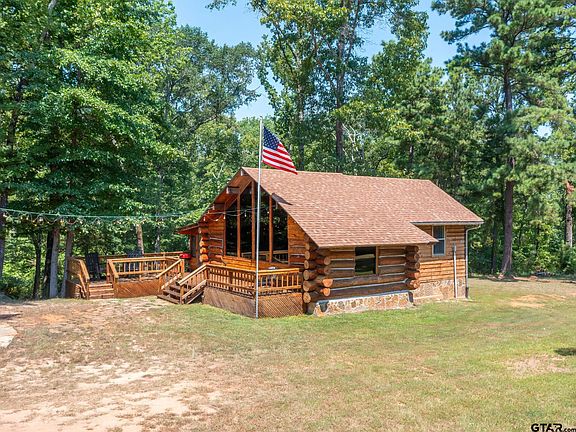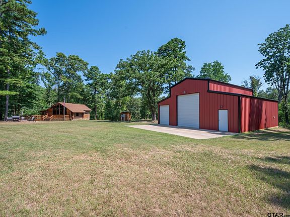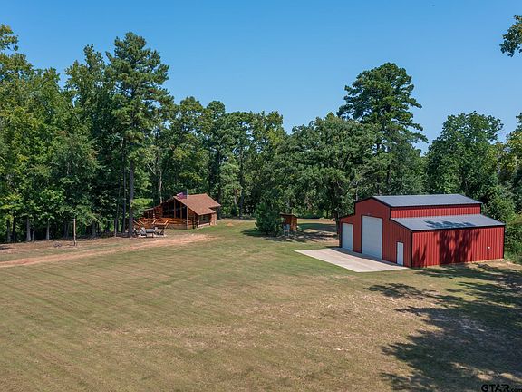 Nestled among the trees on 11.945 acres, this little cabin in the East Texas woods is the perfect getaway for family and friends. You'll enjoy sitting around the outdoor firepit on those crisp fall evenings. Walk up the steps of the deck to a screened porch, and then step inside the fully-furnished cabin where you'll find a wood burning stove, a vaulted ceiling, and a wall of windows to enjoy the view of this beautiful property. The cabin has 1 bedroom and 1 bathroom, but can sleep 5 with pull-out sofas. The main living area features a wall of bench seating with storage under the large window, table with chairs that seats 6, and a tv that streams off wi-fi. The previous owner built the cabin of logs harvested off the property. The pine floors and ceiling add to the rustic charm of "The Cabin." Outside you'll find a flushable outhouse with shower that is on its own septic system, and a 40'x40' metal barn with a 14' door with opener that is perfect for storing your RV. Inside the barn is an abundance of plugs, including a 50 amp for an RV. There is great task lighting and decorative lighting already in place since this barn has been the sight of weddings and parties. Outside is a 30 amp plug for another RV, so you can invite your friends to come visit. When not using the property for themselves, the Seller also hosts "The Cabin" as a success AirBnb that has a rating of 4.97 stars. Convenient to Hwy 31, this property is loved by people going to Canton and Tyler, and visiting friends and family in the East Texas area. The land is beautiful and has several areas where additional cabins or a small chapel could be built if a buyer wanted to use this as a venue. As you venture into the woods, you'll find some wonderful trees just asking for a zipline to be installed to add to the fun. As mentioned earlier, this property is being sold furnished, but seller is exluding the BBQ smoker, metal outdoor table with chairs and the wooden chest under the tv.
