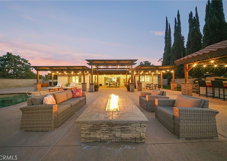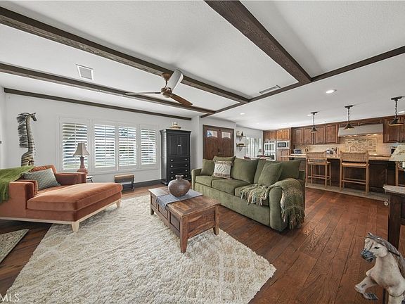 Wake up to panoramic San Bernardino Mountain views in this beautifully updated, 2,875 sqft single-story entertainer’s retreat located in the desirable Woodcrest community. Featuring 3 bedrooms and 3 bathrooms, the home’s vast circular driveway and a three-car garage, providing ample parking for over eight vehicles. Inside, beamed ceilings and recessed lighting illuminate an open-concept floor plan featuring a chef’s kitchen with high-end appliances, a massive island, a formal dining area and flexible living space. A unique central atrium offers a private sanctuary for indoor-outdoor lounging. The thoughtful split-wing layout ensures privacy for the primary suite, which boasts direct mountain views, an expanded walk-in closet, and a spa-like bath. The backyard is a true resort-style masterpiece, fully equipped with a swimming pool, fire pit, and a sprawling covered outdoor kitchen with a bar, sink, and fridge—all set against an immaculate mountain backdrop. Modern upgrades including a tankless water heater, a whole-house water softener, and fresh exterior paint make this turnkey estate as functional as it is breathtaking.