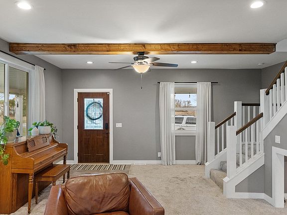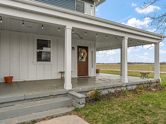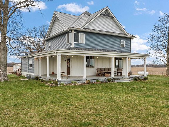 Completely renovated in 2021, this farmhouse features 4 bedrooms and 3 baths on 3.28 acres! The open wrap around porch welcomes you into a large living room with recessed lighting, built-in stereo system and beautiful rustic beams. The kitchen features bright white cabinetry, Corian countertops, subway tile backsplash, farmhouse sink and stainless-steel appliances and opens into the dining room space with breakfast bar and glass sliding patio doors to the deck. Breakfast room or den/office off the kitchen and huge walk-in pantry with built-in shelving, plus large main level laundry with storage cabinets and butcher block countertop for folding clothes. Downstairs full bathroom for guests plus a main level bedroom suite with walk-in closet and private full bath with tiled walk-in shower. Three additional bedrooms on the upper level with spa-like bathroom featuring ceramic tile flooring, double vanity, soaking tub, large tile double shower and built-in storage. Additional second floor laundry for convenience. Siding, windows and doors all new in 2021 plus fresh paint all throughout the home. Reverse osmosis system and AC new in 2022, water heater and dishwasher new in 2023. Brand new LVT flooring in kitchen, den, pantry and dining room just before listing! Partial unfinished basement with sump pump. 2 car detached garage with new doors, opener and updated electric (2021). Additional 20x50 outbuilding that would be perfect for a workshop or studio! Asphalt circular driveway, large partially fenced yard and refreshing countryside views.