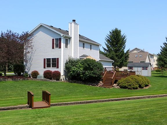 Beautiful Barone-built four bedroom, two 1/2 bath sided colonial with front porch, wood-burning fireplace, finished basement and many upgrades. Recent furnace, hot water heater, sump pump, shutters and 30-year architectural roof. Dining room features chair molding and tray ceiling. Master bedroom features cathedral ceiling, ceiling fan and master bathroom. New quartz kitchen counter tops, plumbing and electrical fixtures. Large two-tiered deck overlooks bricked-in babbling creek with bridge and 30 evergreen trees (no leaf raking). Large shed, flagpole, playhouse and swing set complete the oversized yard (170' x 200') designed for children and entertainment. As a bonus... A four-post hydraulic automotive lift for the car buff for maintenance and car storage!