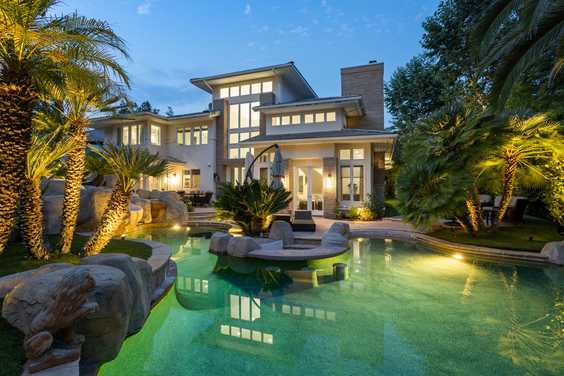 Sparkling pool and spaCascading waterfallFloating curved staircaseResort-like backyardSophisticated fireplaceOpen-concept layoutPrivate resort-style backyard