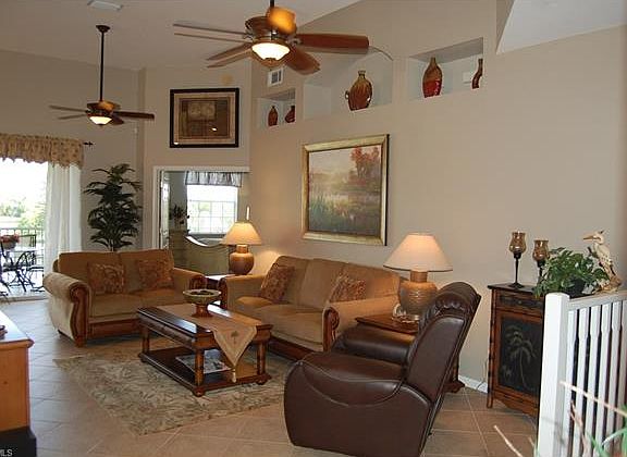 Stunning 3 bedroom, 2 bath carriage home offered turnkey. Home has beautiful lake views and looks like a model home. ALL NEW: electric hurricane shutters, lanai screens, lanai ceiling fan and light fixtures, dining room, living room and kitchen furniture, water heater, A/C, shower heads, fresh paint throughout. EXTRAS included: Alarm monitored system paid through 2018. Ceiling mounted camera with smart phone monitoring paid through 2018. Golf membership (value 24K) with dues paid through 2016. This is a remarkable, must see home.