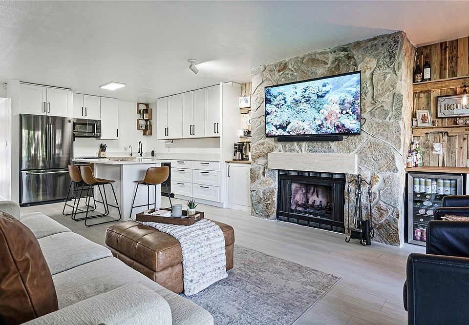 Welcome to The Forest Country Club - 24 hour guarded gate! This exceptional first floor condo is an end unit and has undergone recent renovations with a completely new interior! Upgraded with tastefully remodeled bathrooms, quartz countertops, sleek black stainless steel appliances, crisp white shaker cabinets, and wood-like waterproof vinyl flooring, brand new HVAC system and water heater. The master bedroom boasts a custom walk-through closet with ample space for two. Nestled at the end of the road, it offers lake views and sunsets from nearly every corner of the living space. Charming stone wood-burning fireplace. Additionally, it comes with a carport along with plenty of guest parking. Located in the heart of South Fort Myers, easy access to shopping, restaurants, beaches, schools, and the airport. The Forest Country Club also offers a private country club within the community, rated #1 by Gulfshore Life for four consecutive years! Furniture is Negotiable. Sellers are lic RE brokers in FL. SELLER PREFERS CASH ONLY.