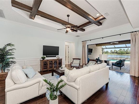 Elegant style, spectacular views, and a convenient Country Club East location with proximity to the private gated entry and The Lodge is only the beginning. This maintenance-free Palmavera floor plan by Neal Signature Homes boasts 2,905 square feet with three bedrooms, two and one-half baths, a den, and a private pool and spa. With a spacious floor plan, expansive covered lanai, chef's kitchen, and additional outdoor kitchen, entertaining is easy and fun. Indoor kitchen has gas appliances, solid wood cabinets, large island, and stone backsplash. The outdoor kitchen has Lynx grill, sink, designer hood and granite counters. Sliders from the great room to lanai pocket and unite indoor and outdoor space beautifully. Pool and spa with Clearview screening showcase the lake and fountain, allowing stunning views and picturesque sunsets. Owner's retreat offers two walk-in closets, dual vanities and a luxurious oversized shower. Home has many upgrades including whole house generator, custom built-ins, wainscoting, crown molding, ceiling details, designer lighting, professionally designed drapes and shutters. Home shows like a model, even the laundry room is a showstopper. The oversized two-car garage is 28 ft. wide with an 18-ft. garage door and plenty of additional space for storage or a golf cart. Residents of Country Club East enjoy The Retreat Aquatic Center. Lakewood Ranch is the best-selling multi-generational community in the USA. Located close to world-class dining, shopping, beaches, and A-rated schools.