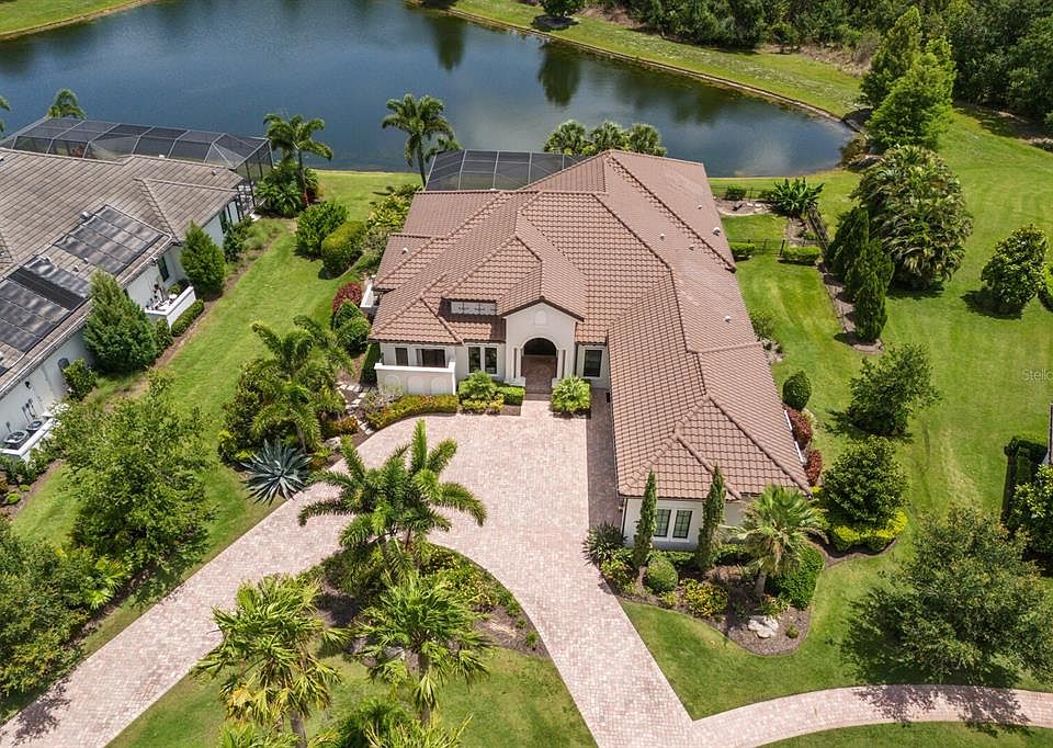 Situated privately on almost a half acre with stellar lake and preserve views in Lakewood Ranch, this meticulously designed and expanded Talia residence in the sought-after Eaglescliffe enclave in Country Club East showcases generously proportioned indoor-outdoor spaces, exceptional craftsmanship, IMPACT windows/doors/sliders, AND even boasts an oversized garage with car lift. Built by John Cannon Homes in 2018 offering 3,434 square feet of expansive one-story open living on a premier Lakewood Ranch lot with circular front drive, and an expanded lanai with a panoramic clear view screen, abundant open and under cover spaces, full summer kitchen, gas firepit, PebbleTec heated saltwater pool and large spa. Seamlessly connecting this resort-styled lanai to the oversized great room and dining area are disappearing 10’ impact glass doors that reveal a large open living concept with voluminous tray ceilings and wood beam detailing. Meanwhile chefs will delight in the beautifully appointed gourmand’s kitchen with SubZero, Wolf and Bosch appliances, sprawling stone counters, custom cabinetry with dovetail soft-close drawers, pull-out storage upgrades, reverse osmosis and a hidden walk-in pantry. Behind double French doors off the great room, lanai, and full pool bath is a voluminous bonus room with disappearing impact glass walls that open to reveal the serene outdoors. Additionally the residence offers an office with double-entry doors, built-in shelving and bench, shutters and wood flooring. Relax and unwind in the elegant owner’s retreat positioned on its own private wing, offering two oversized walk-in customized closets, and a luxuriously appointed spa-like bath with dual sink vanity, and both indoor and outdoor showers. Meanwhile, overnight visitors will be right at home in two generously sized guest suites both with private ensuite full baths. Other highlights of this 5,063 total square foot three bedroom and four full bath residence includes all impact windows and doors, a wine bar with two temperature-controlled refrigerators, built-in mud room storage and cabinetry, laundry room with cabinetry, sink, and closet, 8’ solid core interior doors, fenced back yard, tankless water heater, and rarely-available four car garage option with the addition of a car lift in this oversized 3-car garage with air-conditioned wall unit. Country Club East provides its residents with the privacy of gated-community living, three community pools, fitness center and easy accessibility to world-class shopping, dining, medical facilities & I-75, for an unparalleled lifestyle defined by relaxation & recreation. Residents also have the non-mandatory option to become members of the Lakewood Ranch Golf and Country Club, which offers four championship golf courses, two clubhouses, tennis, pickleball, fitness center, heated pools, full social calendar and so much more.