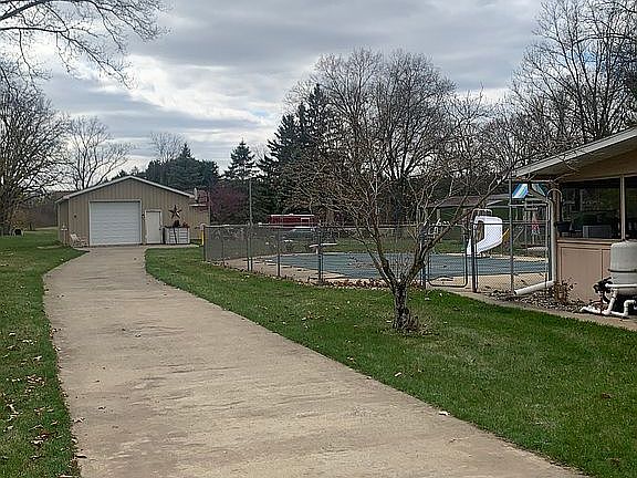 Harper Creek Ranch home. 5 bedroom 3 full baths. Upstairs laundry. Large living room dining room. Three seasons room. Eat in kitchen area. Partially finished basement with egress window. Inground pool 20x40. 6 acres with a Deeded drive to backstage barn and Acreage.Maintenance free.Two pole barns 24 x 48 with bathroom heated and storage above. 24x40 storage barn one slide door and one overhead door 10ft. sale includes refrigerator, stove, microwave, dishwasher, washer/ dryer and hot tub.