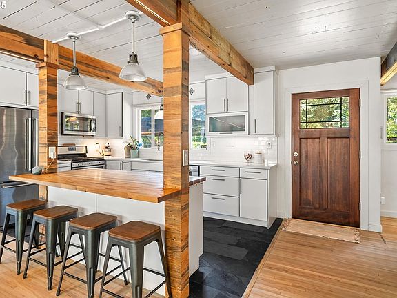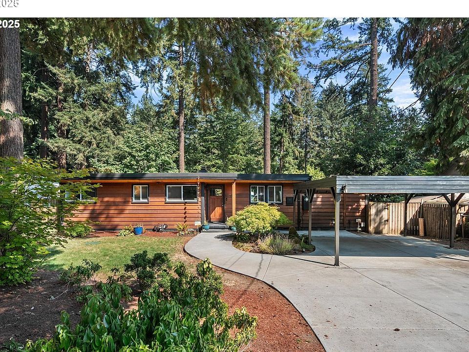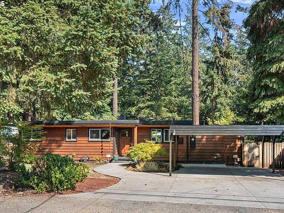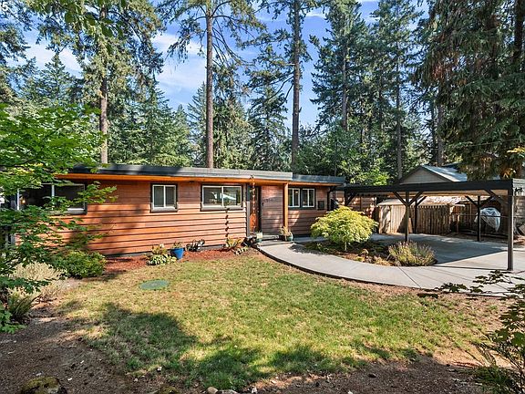 OPEN HOUSE ON SATURDAY, SEPT 27TH FROM 11-1. Located in a peaceful, forested neighborhood, sits this retreat-like 3 bed, 1 bath Mid-Century Ranch in the high ranking Lake Oswego school district. This home is the perfect blend of charm with modern updates. Natural light pours in through the giant picture windows around the living room, framing the natural beauty of the backyard. The open concept living and dining spaces are ideal for both lively entertaining and your usual day to day. Don’t miss the built in storage and bar next to the wood stove, that can be hidden or revealed with a sliding door. The spacious, updated kitchen features quartz countertops, large butcher block island with an eating bar, gas range and lots of storage. The hallway leads you to all three bedrooms, which have the beautiful open beam, wood paneled ceiling you’ll find throughout the entire home. The large bathroom offers a spa like feel with a heated floor, walk-in tile & river rock shower and quartz vanity with storage. The backyard paradise is not to be missed! This space features mature landscaping, raised garden box and a huge 12x14 shed for storage or make into a shop or office. The expansive wrap around patio is an ideal spot to relax and enjoy the lovely landscape around you. Home is conveniently located in Unincorporated Clackamas County, just minutes from shopping, restaurants, freeway access, and parks. Home was extensively remodeled about 10 years ago with new plumbing, electrical (panel & wiring), roof, furnace (2017), HVAC ducting, water heater (2016), windows, floor insulation and more. New septic tank installed in 2015, shed built in 2022 and driveway/walkway concrete was done in 2021. All appliances stay.