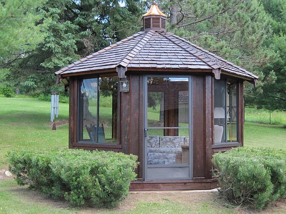 This is a ranch style home with with a beautiful front and back yard on a 4 acre partially wooded lot located approximately 2 miles from Hayward, WI. It has an open design for kitchen and dining and living room area. There are three bedrooms up and two bathrooms. All the bedrooms have walk-in closets; the living room has a gas fireplace. The home has a security system. The home has a built in computer desk in 3rd bedroom on the main level. All bedrooms have walk-in closets. There is a corner built-in china cabinet in dining area. The lower level is partially finished with family and entertainment room. There are beautiful gas fire places on both the main level and lower level. There is also a 2nd bedroom with walk-in closet and an adjacent 3/4 bath. Very large storage room with wire shelving. There is a 12 x 16 ft. Trex deck out the rear patio door that overlooks a large backyard with a beautiful wooded view and cedar gazebo. There is also a back yard storage building. There is an adjacent concrete RV parking pad beside a large 4 stall heated and insulated garage. House, garage and storage building has a new roof I'm 2014. Blacktop driveway recently seal coated. There is also a gorgeous view out the front that is on a very quiet Town of Hayward blacktop street.