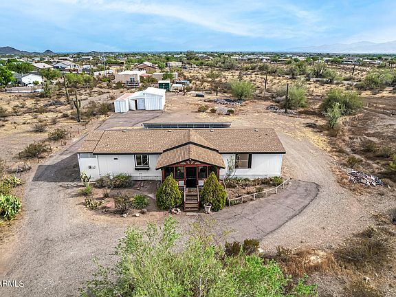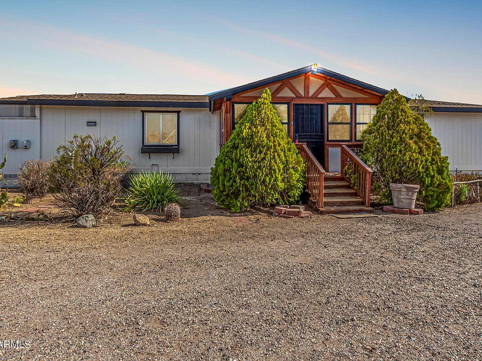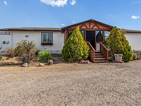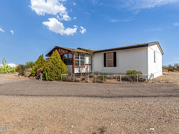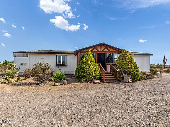 Welcome to this fully remodeled 4-bedroom, 2-bath manufactured home on a sprawling 2-acre lot!! Discover a charming living/dining room with vaulted ceilings, a soothing palette, and stylish wood-look flooring. The eat-in kitchen features quartz counters, white shaker cabinets, a tile backsplash, recessed lighting, SS appliances, a walk-in pantry, and a serving window with a breakfast bar. The sunroom adds a cozy retreat for enjoying the Arizona sunshine. The main bedroom offers an ensuite with dual sinks and a walk-in closet. Outside, you'll find a deck for leisurely afternoons. A large shed provides additional storage and parking space. Abundant space for crafting your dream oasis or establishing equestrian facilities. Modern luxury meets serene country living! Make it yours!