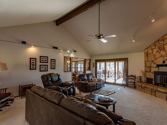 Charming waterfront home, in established neighborhood of Buffalo Shores South. Spacious yard, 100' Grand lake shoreline. Covered Boat Dock, 2 slip, seawall, gravel beach front, mature tree, water feature, wood deck, covered and open areas. Home features spacious living room, vaulted beam ceiling, natural rock fireplace, Gas Logs, Wall of windows, deck access, Formal Dining room, huge kitchen with breakfast nook, eating bar, lots of counter space and cabinetry. Master Suite with adjoining sunroom, South facing, lake views, deck access. Master Bath features updated master shower, and double vanities. Split Bedroom design, features 2 guest bedrooms with full bath between. Adjoining Master bedroom is lower level office & access to workshop.Amenities Club house, Pool, and play area. NO VRB