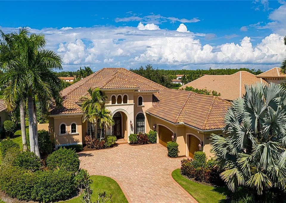 The long lake views and stunning sunsets cannot be missed in this exceptionally designed open, great room home. Fresh and bright, you'll love the open spaces from the kitchen to the great room with ten-foot sliding glass doors leading to the oversized outdoor space and expansive pool deck, creating the ultimate 'indoor-outdoor' living experience. Transitional elements are evident with clean lines & warm colors. Enjoy the chef's kitchen with highly-rated appliances including a gas cooktop or enjoy a Florida evening while grilling out at the custom outdoor kitchen. Additional details include stone flooring in the main areas and wood flooring in the master bedroom and study, custom ceiling treatments, and impact windows and doors. Imagine relaxing at the pool or enjoying the glow of the pool's fiber-optic lighting while sitting at the built-in fire pit and enjoying magical Florida sunsets. This home, a combination of simplicity and luxury, cannot be missed. Located in Mediterra, an award-winning private club with a commitment to excellence that has led to three Distinguished Emerald Club Awards.