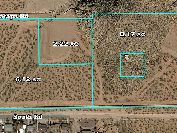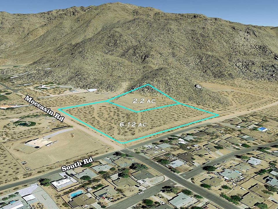 Absolutely amazing lots located just down the street from Sunset Hills. Nestled up against the hills, first we have a 2.22 ac lot with certified pad and water lines already run around the property. Owner has beams designed to support bridge over drainage channel leading up to the pad, which has been filled and decorated with rocks/boulders. The pad provides views of the entire valley and is ready to build. Next we have 6.12 ac with water access, a meter and address (16549 Moccasin Rd). To further value these properties, there is already a base block wall along the entire North Side of both lots and the entire West and South sides of the 6.12 ac lot. All it needs is finishing. Both parcels are being offered together for a total of 8.34 ac. Current zoning will not allow the larger parcel to be further divided. Arrangements can be made for construction loan and builders, inquire. Adjacent 8.17 ac also available (see map). APN's included in sale: 0437-553-23 and 0437-553-22