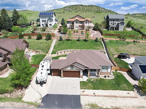 Casual elegance in premiere South Table Mountain area of Golden! Exquisite one level living combined with immaculate lower level design! Custom finishes throughout! Fabulous opportunity to experience the Colorado lifestyle a short walk to South Table Mountain Park! Light filled open floor plan perfectly positioned on a beautifully terraced lot with extensive landscaping. Enjoy relaxing moments in the hot tub or taking in the views! Designer kitchen, island and stunning fireplace create the perfect setting for gathering! The main level boasts a luxurious primary suite with five piece bath and spacious walk in closet. There are two secondary main level bedrooms , one offering a built in Murphy bed and custom cabinets. The laundry room is conveniently located on the main level adjacent to the large three car heated garage. Recently finished basement is a true retreat with full kitchen, family room, bedroom, bathroom and large walk-in closet! Finish selections are gorgeous including the custom built window wells. This home checks all of the boxes! Stunning setting, two separate living areas, RV pad, three car garage, storage shed, upgrades galore! Amazing opportunity with premium Golden location!