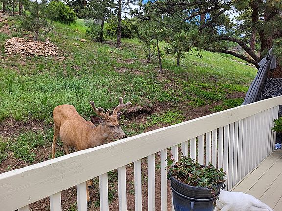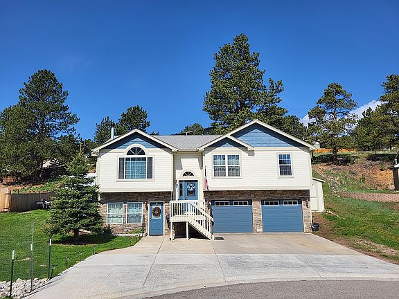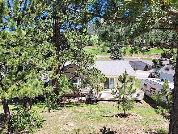 One-owner two-story ranch style home on quiet cul de sac in Estes Park with beautiful mountain views and lots of wildlife. It is surrounded by a large yard, big trees, and kind neighbors. The home has classic bones that can be easily updated and expanded to support your personal style. This home has informal spaces, a garage workshop, utility shed and storage space for your RV or trailer, fenced dog run just off the newly painted back deck. The full basement (15 x 32) is set up for a mother-in-law quarter with separate entrance, a walk-in closet, full bath, and bar area. It stays naturally cool in the summer and has its own gas heater. The laundry room has lots of storage cabinets and a sewing/craft table with a wall mounted ironing cabinet. It also has an expansive two-car garage (23 x 32) with its own workbench, storage cabinets and gas heater. On the upstairs main level there are two bedrooms (14 x 9) and (14 x 11) plus a full master suite (17 x 14) that includes a Her’s walk-in closet and a His large 8 ft. bypass closet. The master bathroom has a soaking tub, shower, double vanity and 2 linen closets. The stairs and main level have hardwood floors, with ceiling fans in all rooms. This home is made for a family. Space for BBQ’s on the back deck, tending flower beds in the front, gathering for holiday dinners in the informal dining area and kitchen bar, watching Bronco games by the woodstove. An outside door allows for loading the custom-built interior wood box. The kitchen counters have brand new quartz, new tile backsplash and a huge new sink. Lots of storage in the kitchen cabinets, all newer stainless-steel appliances. A single, loving family has enjoyed this place for the last 23 years. Now it is your turn.