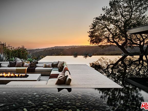 Set within a premier enclave of Trousdale Estates, this 6,500-square-foot architectural masterpiece merges contemporary luxury with the distinctive character of midcentury-modern design. Surrounded by panoramic views of the Santa Monica Mountains, this two-bedroom, four-bathroom estate offers an unparalleled living experience in one of Beverly Hills most coveted neighborhoods. In collaboration with Lucas Design Studio, the residence embodies soft contemporary architectural precision and material mastery, featuring an array of exotic finishes selected for their beauty and integrity, along with four sculptural gas fireplaces that bring warmth and architectural presence to the home. Floor-to-ceiling windows invite natural light and stunning vistas into every room, creating a harmonious flow between indoor and outdoor living. A striking flame-sprayed nickel wall extends from the exterior into the living room, setting the stage for a curated collection of design icons, including a curved Vladimir Kagan sofa, an Ado Chale coffee table, and a Paul Evans I Wavy front credenza, all resting atop a custom wool and silk rug from Fedora Design. Art takes center stage in this residence, with commissioned works throughout, including a mesmerizing light sculpture by LA artist David Wiseman that illuminates the sunken TV lounge. Inspired by the surrounding landscape, Wiseman cast acorns from the property's trees, incorporating them into the intricate design. At night, the sculpture transforms the space into an enchanting retreat, evoking the feeling of relaxing beneath a starlit canopy. The dining room exudes sophistication, with a Herve Van der Straeten dining table, complemented with dining chairs by designer Hans Wegner. The open-concept kitchen is equally striking, featuring wire-brushed and cerused rift oak cabinetry, quartzite countertops, and dazzling custom lighting. The primary suite is a unique sanctuary, with a custom-upholstered bed, luxurious textiles from de Le Cuona, and designer pieces by Roger Capron and Paul Evans. The vast spa-inspired primary bath is a study in exquisite stonework with two Toto toilets enhancing the spa-level experience. Midcentury Swedish flatweave rug, and vintage sconces elevate the guest suite's atmosphere of curated luxury. Floors are Terrazzo, bantered by bordered by limestone edges. Outside, the infinity pool extends to the edge of the living room, creating a seamless visual connection between water and sky. Thoughtfully designed outdoor spaces offer ample room for relaxation and entertaining, with breathtaking views serving as the perfect backdrop. A rare offering in a historic enclave once home to legends like Frank Sinatra and Elvis Presley, this residence is a masterclass in design, blending artistry, luxury, and architectural integrity. This estate is being offered furnished as curated for someone desiring a highly designed atmosphere throughout. Particular attention was paid to the lighting design for the home, pool, and landscaping, to the point where the homeowners insist that interested Buyers experience the property both during the day and in the evening to fully appreciate it. Highlights include Italian iGuzzini laser lighting integrated throughout the home. The residence is prominently featured on the sites of its creative partners - Lucas Studio (lucasinterior.com), TLD Lighting Design (t-ld.com), and Hocker Design Group (hockerdesign.com) offering an additional lens into the home's exceptional design.