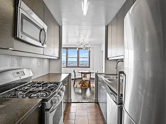 This spacious home wows with million-dollar views of the Manhattan skyline from every room and an abundance of natural sunlight that's wonderful for houseplants. A gracious foyer with a large closet invites you into a massive open-plan living/dining room to discover designer lighting, gorgeous built-ins and gleaming wide-plank engineered hardwood floors. The large turf balcony is the perfect vantage point for enjoying Fourth of July fireworks and stunning sunsets. In the outstanding galley kitchen, custom floor-to-ceiling cabinetry boasts under-cabinet lighting and beautiful thick wood countertops. The fleet of stainless-steel appliances includes a gas range, bottom-freezer refrigerator, dishwasher, and built-in microwave.