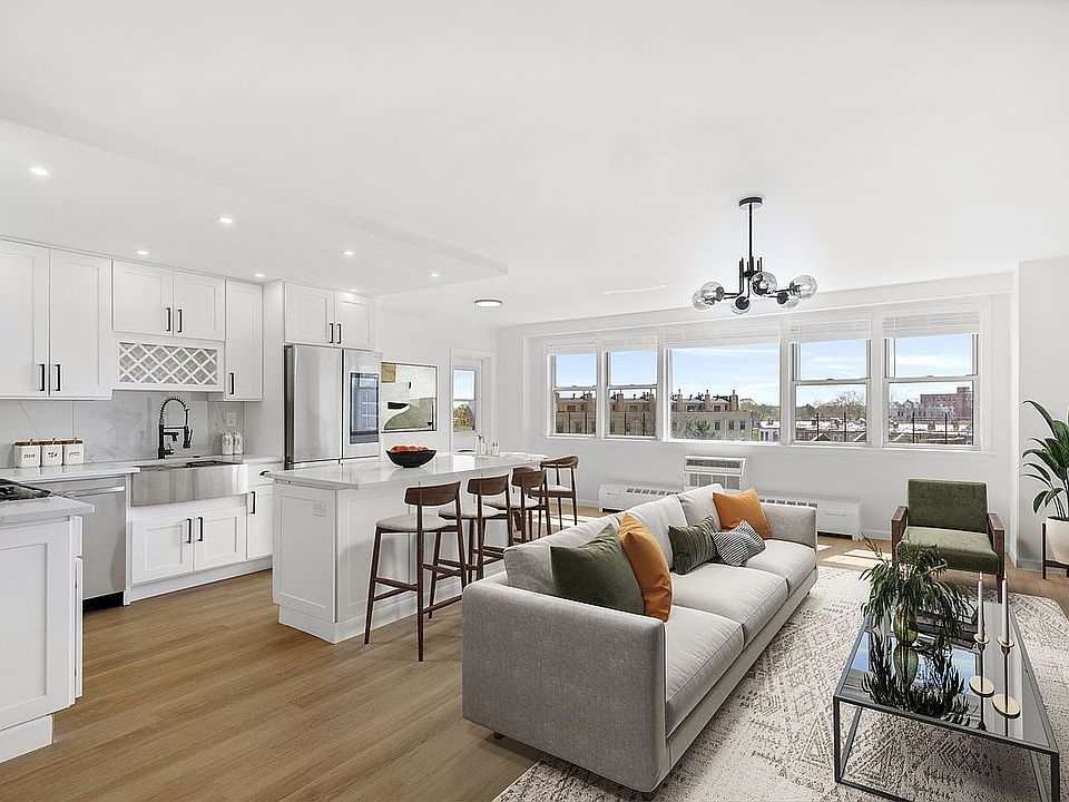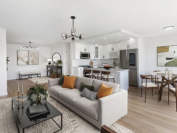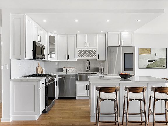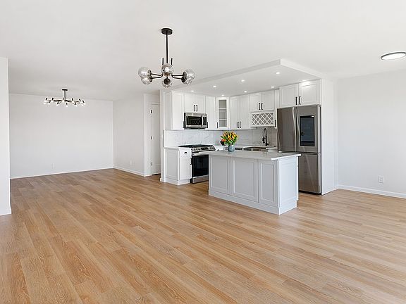 This stunning and rare corner unit has been completely renovated and offers an abundance of natural light throughout its expansive nearly 1500 square feet of living space. With unobstructed views from its 13 windows, this true 3-bedroom, 2-full bathroom co-op is a standout in its class. The open layout living and dining areas seamlessly flow into the stylish kitchen, which boasts shaker cabinetry with soft closers, quartz countertops, and a striking matte black single-handle pull-down sprayer kitchen faucet with LED lights that change automatically with water temperature to protect your family from cold and hot water. The sleek Samsung stainless steel suite of appliances includes a Family Hub smart refrigerator with built-in Alexa and many other fantastic capabilities. The kitchen also features a garbage disposal and a handsome center island that accommodates up to 3 bar stools seats.