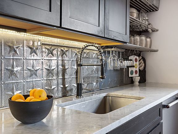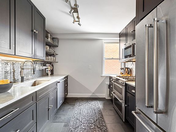 LIVE LARGE AND IN STYLE! Elegant, dramatic, fully renovated midcentury apartment exudes Urban Chic! The spacious, light-filled flexible 2-bedroom apartment features a stylish chef’s kitchen with tin backsplash and stone floor, a large living room with a dining area, an adjacent private balcony, a luxurious, jaw-dropping bathroom with a walk-in shower, generously sized bedrooms, and wide-plank, dark hardwood floors throughout. Second bedroom functions as an office and a guest bedroom thanks to the recently installed Murphy bed. The windowed extra-wide galley kitchen features a KitchenAid dishwasher, refrigerator, and microwave. GE gas double-oven range (also with convection setting). The real tin kitchen backsplash adds texture and visual interest. Calcutta Marble kitchen and bathroom countertops, in shower enclosure, and Montauk Black Slate flooring in the kitchen, bathroom, and terrace flooring elevate this already gorgeous apartment. The rest of the floors feature engineered hardwood over concrete protected by a deluxe, sound-dampening barrier. The jaw-dropping shower floor is river stone. The shower panel has 8 massage jets, a rain shower head, and a hose. The unit has a spacious balcony which allows for a wonderful place to enjoy coffee in the mornings or a glass of wine in the evenings while watching the sunset.