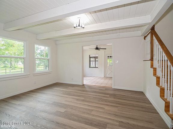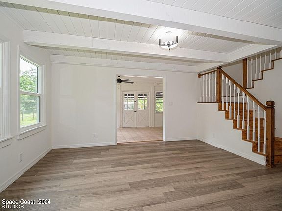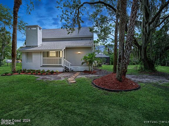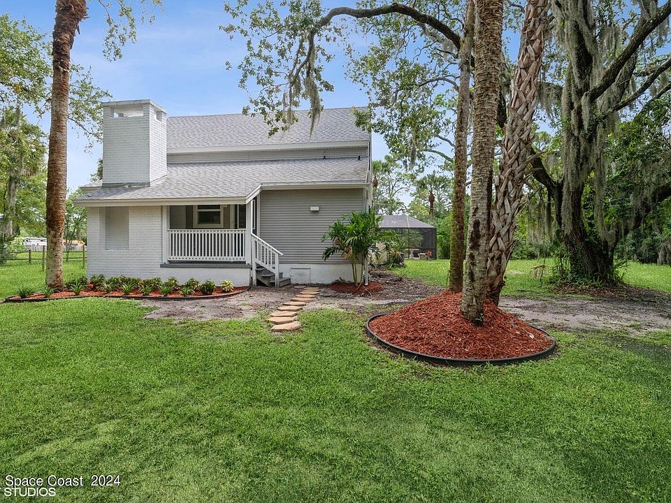 A Dollhouse where you can sit on the front porch, rope a swing around the many old oak trees and then cool off in the large backyard pool. Enjoy quiet living on your 1 acre lot! So much of this house is new. New roof. The kitchen was remodeled with popular white shaker cabinets & quartz countertops. Be the first to use the cabinets, countertops & appliances in this gorgeous kitchen. Baths have also been updated with granite topped vanities, white subway tiled tub/shower. The low maintenance luxury plank vinyl floors look like real wood, without the maintenance. Too many updates to list from the mirrors to the lighting. Beautiful brick Wood burning fireplace with a Shiplap ceiling in the great roomThis house is a showpiece with a private driveway, a humongous shed and it is 5 minutes to grocery stores, restaurants and all amenities. Watch rocket launches from your yard or take a short car ride to the beach. Only a 45 minute drive to Orlando airport, Disney & all the attractions