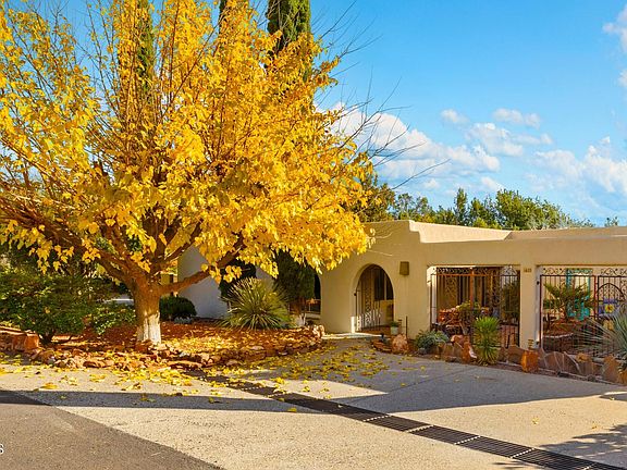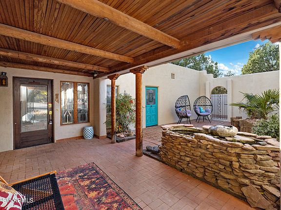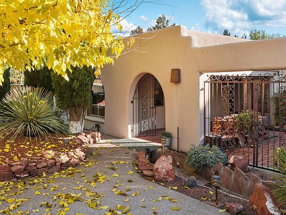 What an opportunity. Journey through this West Sedona Gem boasting a large main home and separate casita/studio on 2 separate lots combined into your private compound. Live in one and rent the other! Need an in law suite? Art studio? Multiple workshops? You can find it all here at 1655 Johnny Guitar Street. The 2034 square foot main home unfolds with a rich tapestry of features; exterior front courtyard wrapped with iron Spanish gates and fencing, wood viega beams, crossed brick floors and an outdoor water feature are some of its appeal. Sit outside here to enjoy the glow of the setting sun on Thunder Mountain. The sound of water continues as you are welcomed inside by an entry atrium with an indoor water pond, inlaid wood ceiling and Saltillo tile flooring. How enchanting to have the sound of water in your home! Warm Oak and Saltillo flooring flow through this 3 bedroom 2 bath home with subtle nods to Mexican design touches. Myriad living spaces are offered including a main living room with a green hued stone slate woodburning fireplace, center open family room, dining room, kitchen, laundry room, mud/garden room and huge unheated workshop or game room. Dining Area spills out onto a raised wood deck overlooking an enchanting tree filled fully fenced backyard. Primary bedroom offers a ¾ bath etched with Wood Walls, cobalt blue Mexican tile, and a walk in glass shower! It too opens onto its own private side courtyard to take in the night air. Perfect place for a hot tub as it has 8 foot walls - what privacy! Galley Kitchen with loads of cabinets and newer appliances meanders towards laundry room, mud room/garden room and an extra bonusm (not included in the square footage) - a huge 480 square foot unheated workshop with separate sink and exterior door! 2 good sized bedrooms and ¾ bath hall bath with tin ceiling complete the main home! Walk over to the Studio, originally built as an artist studio, it is a massive 744 open space with 14 foot ceilings, concrete floors, a huge floor to ceiling walk in closet, solar powered water heater, ¾ bath, covered 2 space carport and a 4 car tandem garage. WOW!