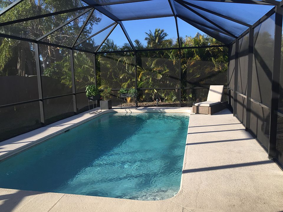 Come take a look at this beautifully updated home in the great location of Cypress Lake Country Club Estates. Gorgeous 3 bedroom 2 bathroom split floor plan with new pool and large lanai in 2013. The master bedroom has two closets and the family room has a beautiful bay window. This home has been completely updated! Some of the 2010 updates include; all new windows, new air conditioning including ductwork, new travertine flooring, new inside paint, new kitchen with corian countertops, new bathrooms with a heated, jetted tub. Some 2012 updates include; a new roof and new outside paint. In 2013 the pool was added with a privacy fence and areca palms and garden plot. A built in desk unit in the den/playroom is a great feature for your workspace needs. The home has an irrigation system and no HOA fees. There is an awesome children's playhouse in the backyard that was built in 2013 that the children or grandchildren will love! This home is truly move in ready and won't last!