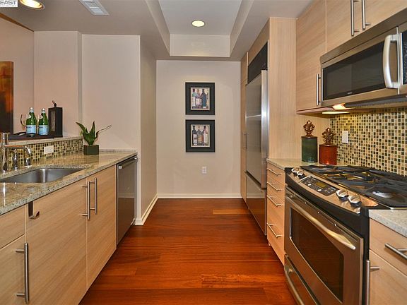 Stunning 2 bedroom, 2 bath Mercer condo first time on the market, situated in prime downtown Walnut Creek location walking distance to fabulous shops and restaurants, Lesher Arts Center, and BART. Truly a special unit with unique condo living perks! This unit has the luxury of no shared walls or neighbors on either side and conveniently located closest to elevator, lobby/stairs and building amenities. Extremely clean and in exceptional condition this unit features warm Iroko hardwood floors with upgraded underlayment preventing any hollow sounds when walking, custom carpet and freshly painted interior, including walls, baseboards and ceiling. Kitchen features top of the line Subzero and Bosch stainless steel appliances, gas range, custom tile back splash, granite counter-tops, and soft close cabinetry with a sleek/modern design. Recessed lighting though out boasts a bright yet cozy feel. Separate laundry room with cabinet storage, dryer and newer washing machine. Spacious master contains Hunter-Douglas window coverings, walk-in closet with built-in organization, and over-sized master bath. Master bath features are comprised of a sunken tub (not once used), separate shower, closed off toilet room, upgraded cabinet organizers, built-in mirrored cabinets, double sinks and the finest of finishes. Second bedroom is the perfect space for endless uses, such as; office, den, guest room, or nursery. Off the main living space is private little patio which over looks the urban charm of city life and trees that change with each season. Unit features two parking spaces, and separate storage locker. Mercer living at its finest, including all the bells and whistles: Onsite concierge, recreation room perfect for meetings and parties, resort like lap-pool and spa area, fitness center, built-in BBQ area and Zen like courtyards with luscious bamboo. A true gem!