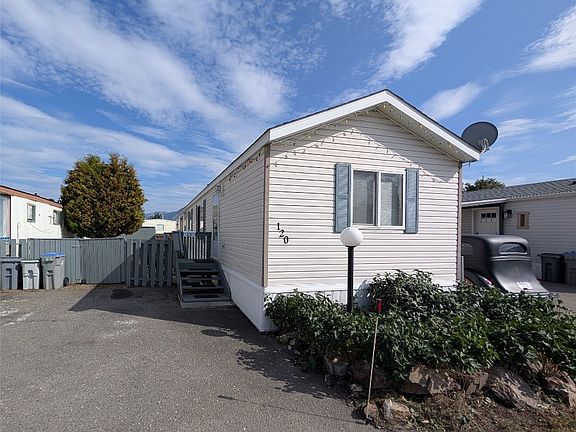 Welcome to unit #120 at Orchard Manufactured Home Park. This 2008 2 bedroom, 2 bathroom unit is sparkling clean and shows like new. The layout is ideal with a bedroom and a 4pc bath at both ends of the home for separation and privacy. In between the bedrooms you'll find a bright open concept living area with the kitchen, dining and living room all connected. The hot water tank was replaced in 2020, brand new carpets have been installed July 2025, a full interior paint completed July 2025, and the unit has been professionally cleaned. There are two exterior doors that lead into the yard which has been professionally cleaned and is ready for a new owners ideas. Currently there are some patio stones and two sheds for extra storage, the exterior decks, fence and large shed have also been recently painted. There is a swing gate that opens into the yard, and parking for two vehicles out front. This park is close to many amenities including, golf, shopping, casino, parks and more. Pets are allowed with restrictions and immediate possession is available.
