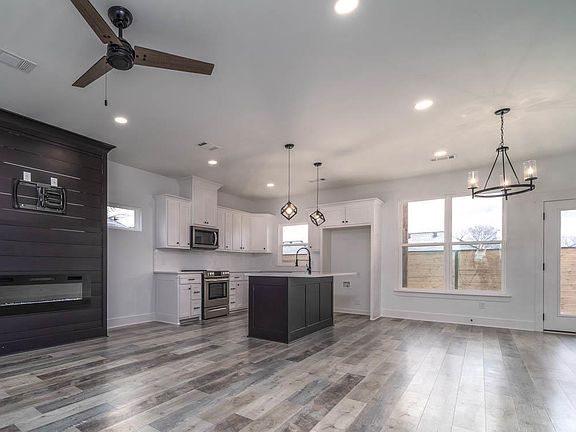 This open, modern 4BR/3BA home is conveniently located close to schools, shopping, restaurants, and interstate! Comes w 2BR/1BA upstairs, 2BA/2BA downstairs, two pantries in kitchen, SS appliances, quartz counters w custom cabinets and an amazing fireplace that can be enjoyed from any of the main areas downstairs. The primary bedroom is private and opens to a massive main bathroom that has an oversized walk in shower w a soaking tub. Luxury vinyl plank throughout the house, attic storage, large closets - so much to enjoy inside this home. Exterior has a covered porch front and back with a beautiful wooden ceiling. Back yard has a tall privacy fence but regardless of whether you're enjoying the front porch or the back porch you can watch the sun rise and set depending on the time of day!