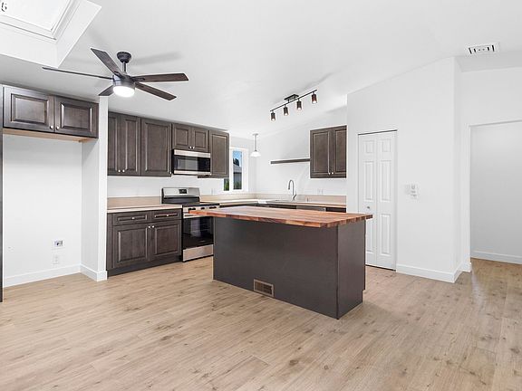- Ceiling Fan(s), High Ceilings, Vaulted Ceiling(s), Kitchen Island, Pantry, Tile