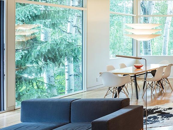 Lovely mid-century modern half-duplex, lives like a single residence, located on a private, peaceful West Aspen lot with seasonal stream, shade and moss gardens. Three-bedroom, 3.5-bathroom light-filled Euro-spaces on 2 levels, all above grade, thoughtfully re-modeled by international/national award-winning architect. Wonderful spaces for warm gatherings or retreats, passive solar, shade in summer, sunshine in winter, wood-burning fireplaces with several outdoor living spaces. Seasonal views to Buttermilk Ski Area and Independence Pass/Shadow Mountain. Additional FAR: 100sf above grade or 500sf basement below grade.