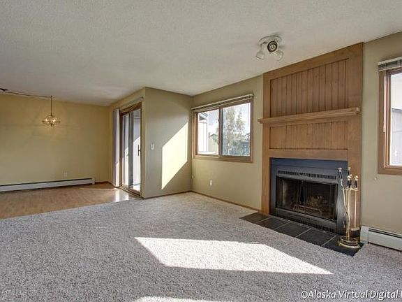 Top floor end unit w/ a deck that overlooks the well manicured grounds & mountain views. Brand new carpet Nice living room w/ a cozy fireplace & large windows to make it light & bright. Master BR w/ access to bathroom. Bathroom has double vanities. Unit has 2 storage spaces and a carport. Convenient location next to trails, Sitka Park, Bases, hospitals & UAA. Heat & Basic cable incl in due