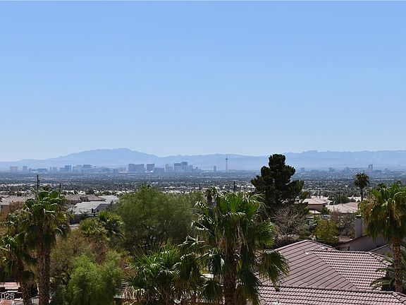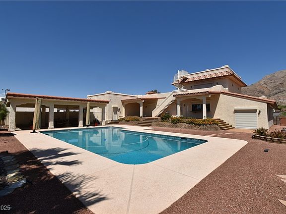 Gorgeous Custom home on a half-acre lot Southwest interior, 3 bedrooms, 4 baths, perfect for entertaining. Formal living & dining room, huge upstairs family room w/Black Granite wet bar, Fireplace, rear deck, front balcony, bay windows and fantastic views. Gourmet kitchen with top-of-the-line stainless steel appliances, custom cabinets, granite counters, island with breakfast bar, breakfast nook, pantry, & more. Downstairs sunroom has vaulted ceiling, 2 ceiling fans, 2 skylights, wood burning stove, & a passive hybrid solar heating system. Primary bedroom with skylight, double doors, walk-in closet, & door to the patio. Gorgeous primary bathroom. 2nd & 3rd bedrooms are very spacious. Gorgeous finished 1927 SQ.FT. basement w/3 rooms. Outside, Spiral staircase to a rooftop deck has 360`view of strip, city, & mountains. Staircases to basement from inside & garage. RV Garage & parking plus a huge 1057 SQ.FT. garage. Gorgeous Pool.